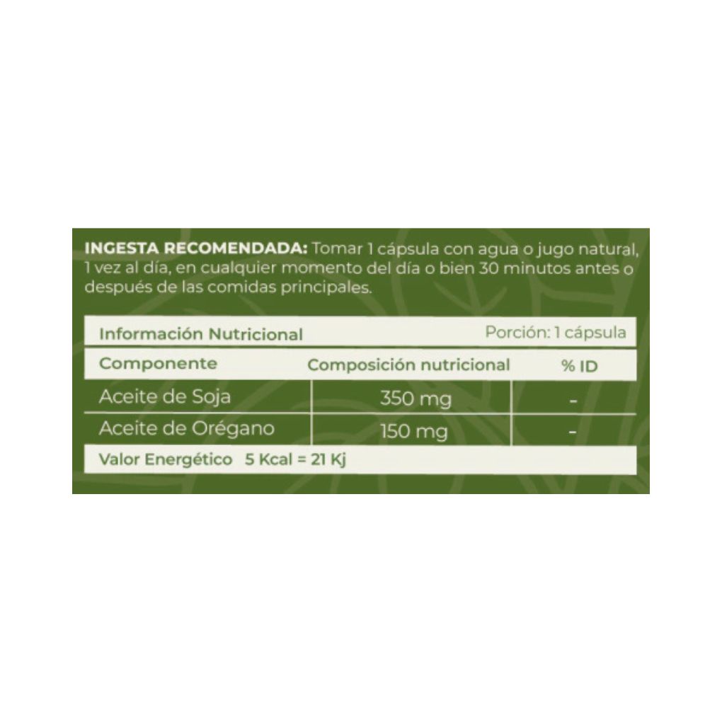 Cada cápsula concentra 150 mg de aceite de orégano estandarizado al 22% en Carvacrol, el compuesto activo responsable de sus propiedades. El carvacrol es reconocido por su acción antioxidante, su capacidad para combatir los radicales libres y su rol como refuerzo natural del sistema inmune. Además, el aceite de orégano contribuye al bienestar digestivo, colabora con el alivio de malestares estomacales y acompaña la salud de las vías respiratorias.
