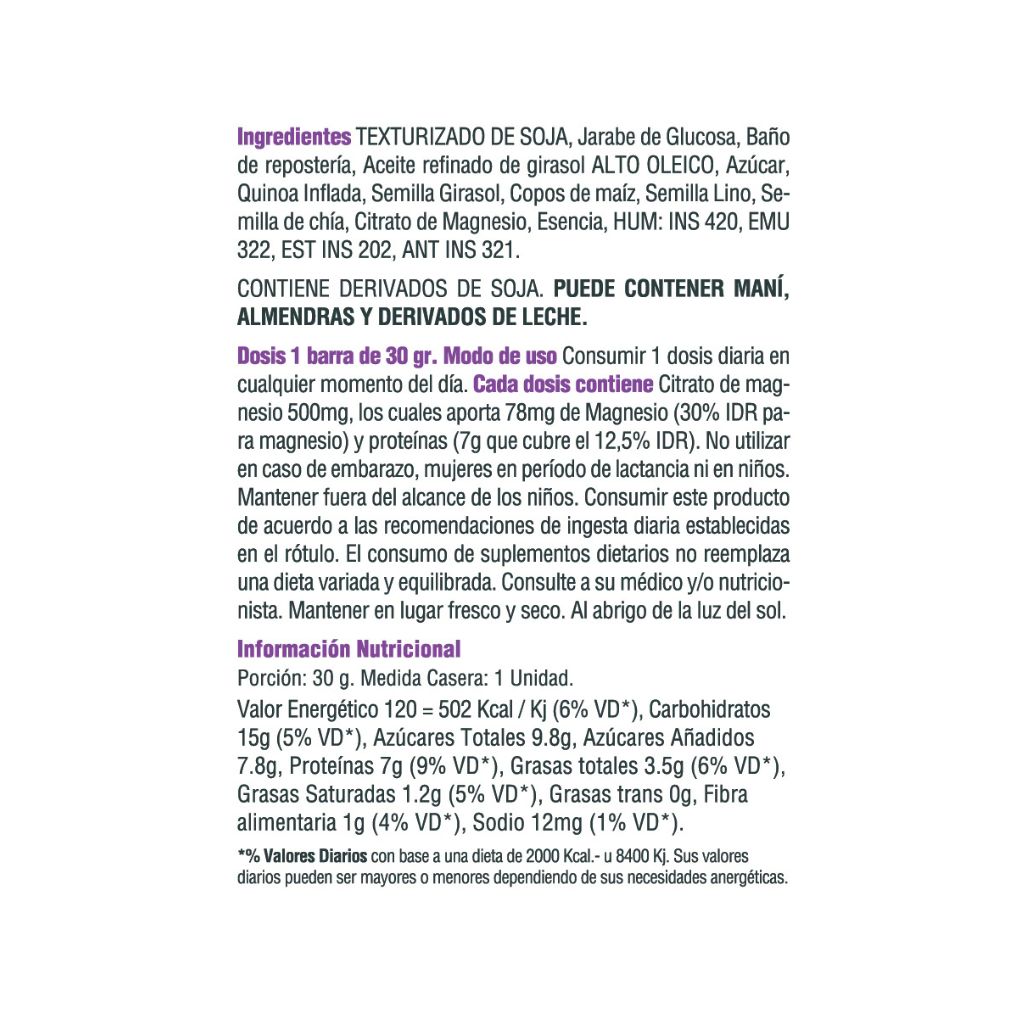 Cada barra aporta 78 mg de Magnesio Elemental y 7 g de proteínas.