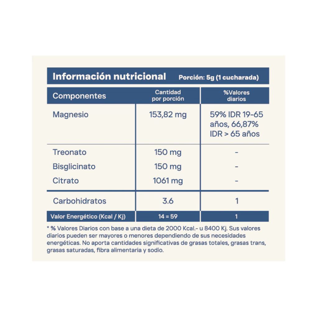 Suplemento dietario | Polvo 150 g | 5 g por porción (153,82 mg de Magnesio) | Treonato + Bisglicinato + Citrato