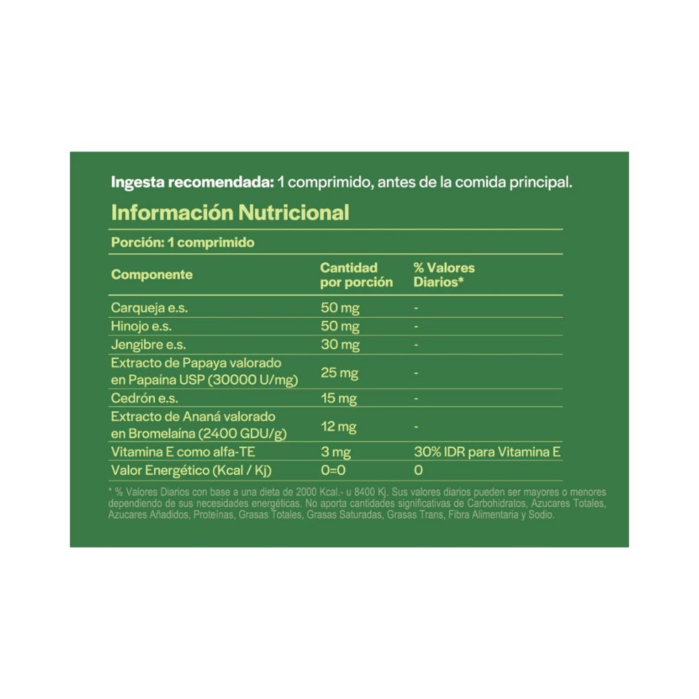 Carqueja, Hinojo, Jengibre y Cedrón junto a Papaína y Bromelaína conforman una fórmula equilibrada y práctica.
