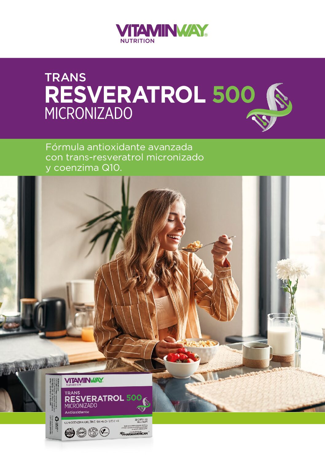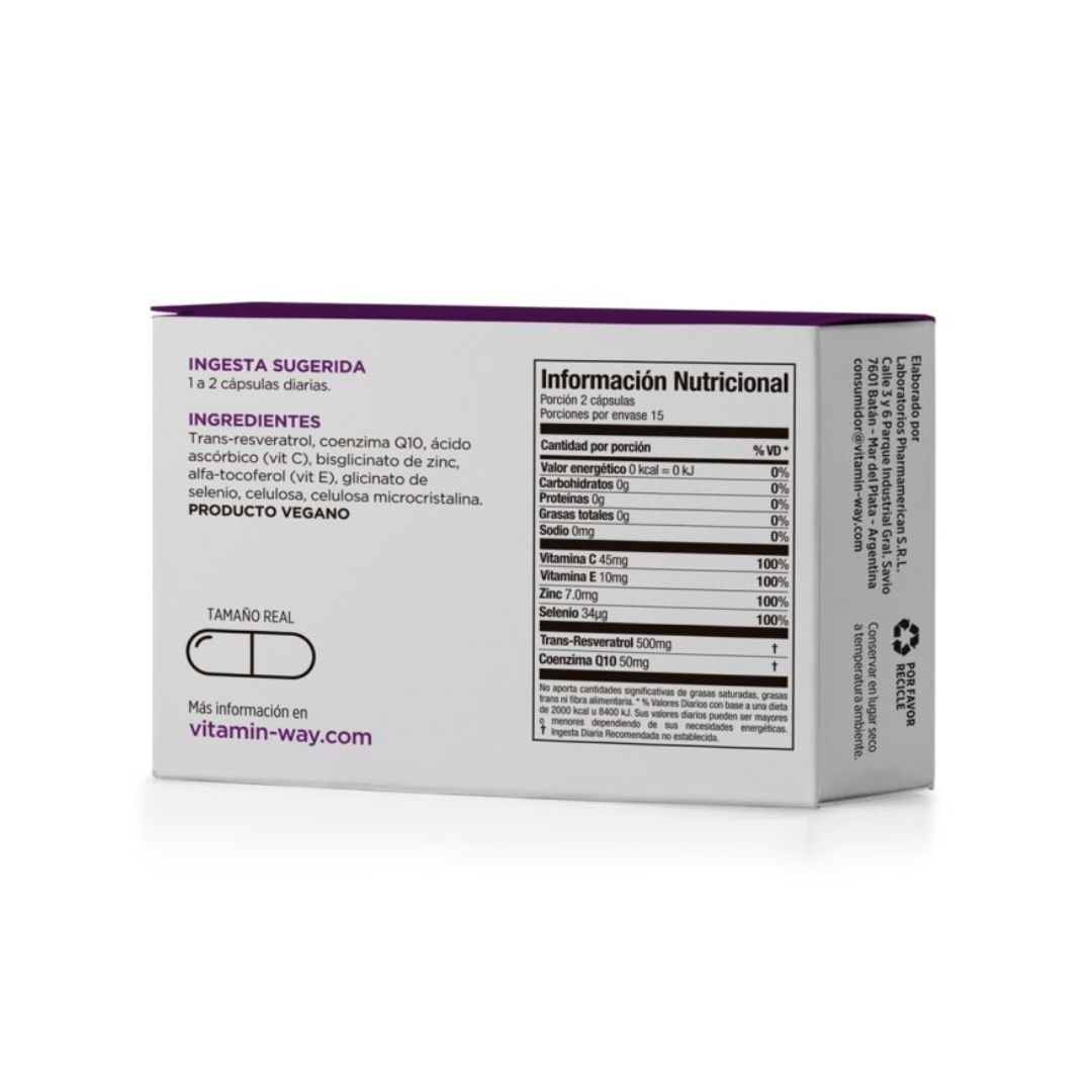 Resveratrol 500 Vitamin Way® aporta ingredientes clave que ayudan a proteger las células del desgaste diario, favoreciendo el buen desempeño integral del organismo. Resveratrol 500 Vitamin Way® está formulado con trans resveratrol micronizado que se caracteriza por su estructura de partículas pequeñas, que mejoran significativamente su absorción y biodisponibilidad en el organismo. Esto permite potenciar sus beneficios antioxidantes sobre la energía celular, el sistema cardiovascular y el mantenimiento de la vitalidad a lo largo del tiempo.