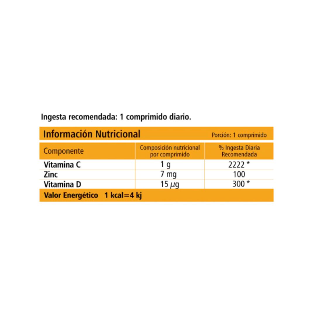 Suplemento dietario a base de Vitamina C, Vitamina D3 y Zinc, en comprimidos, libre de gluten.